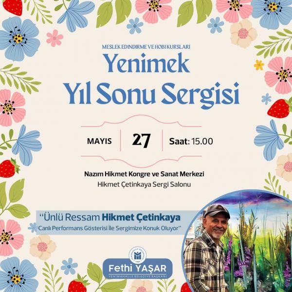 "YENİMEK ile kültür ve sanat dolu 16 yıl." Meslek Edindirme ve Hobi Kursları kursiyerlerimizin yıl boyunca binbir emekle hazırladığı ürünlerinin sergileneceği Yeni Yıl Sergisi’ne davetlisiniz. 27-30 Mayıs tarihlerinde Nazım Hikmet Kongre ve Sanat Merkezimizde ziyaret edilebilecek serginin açılış törenini 27 Mayıs saat 14.00’te gerçekleştireceğiz.